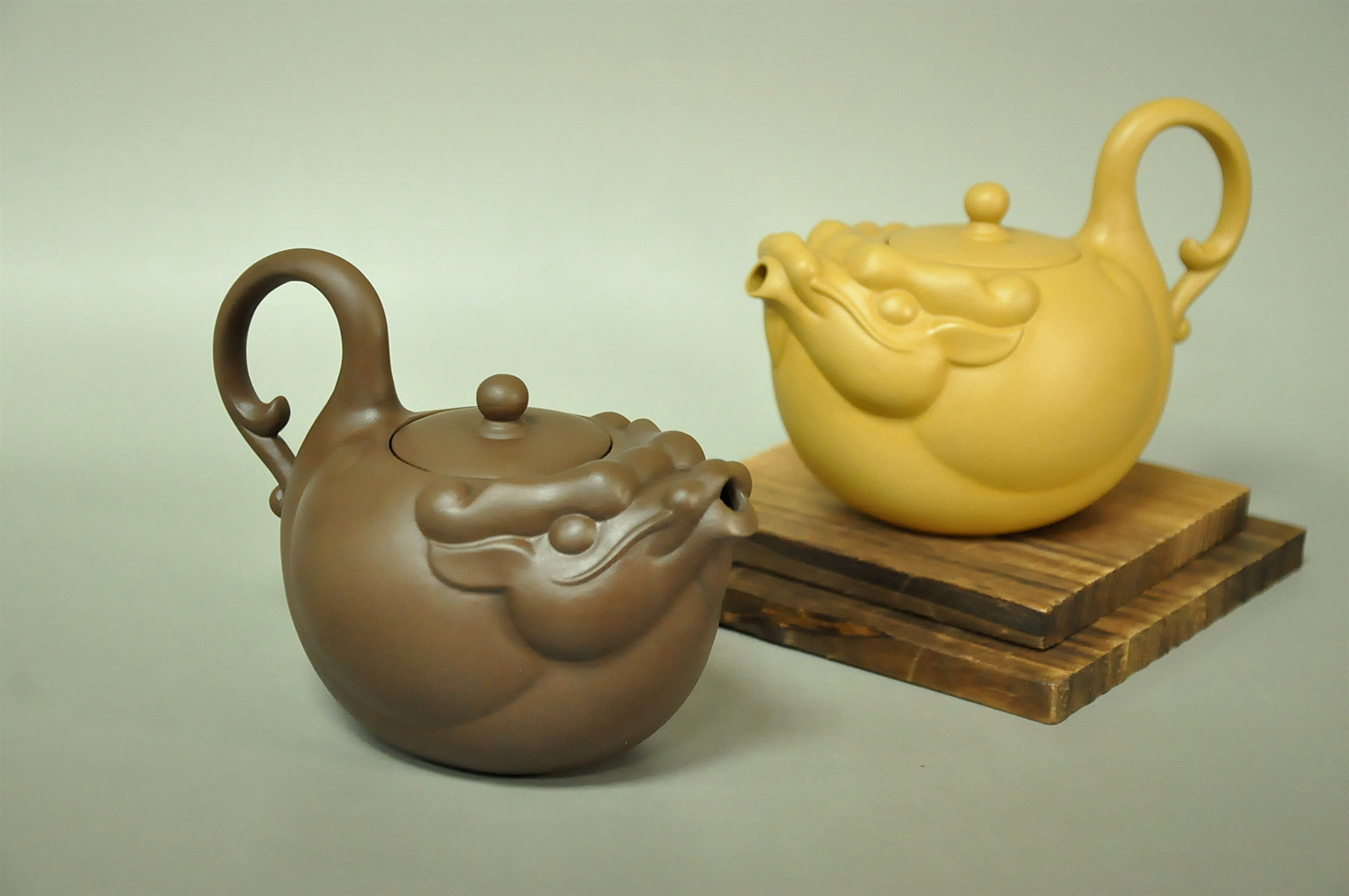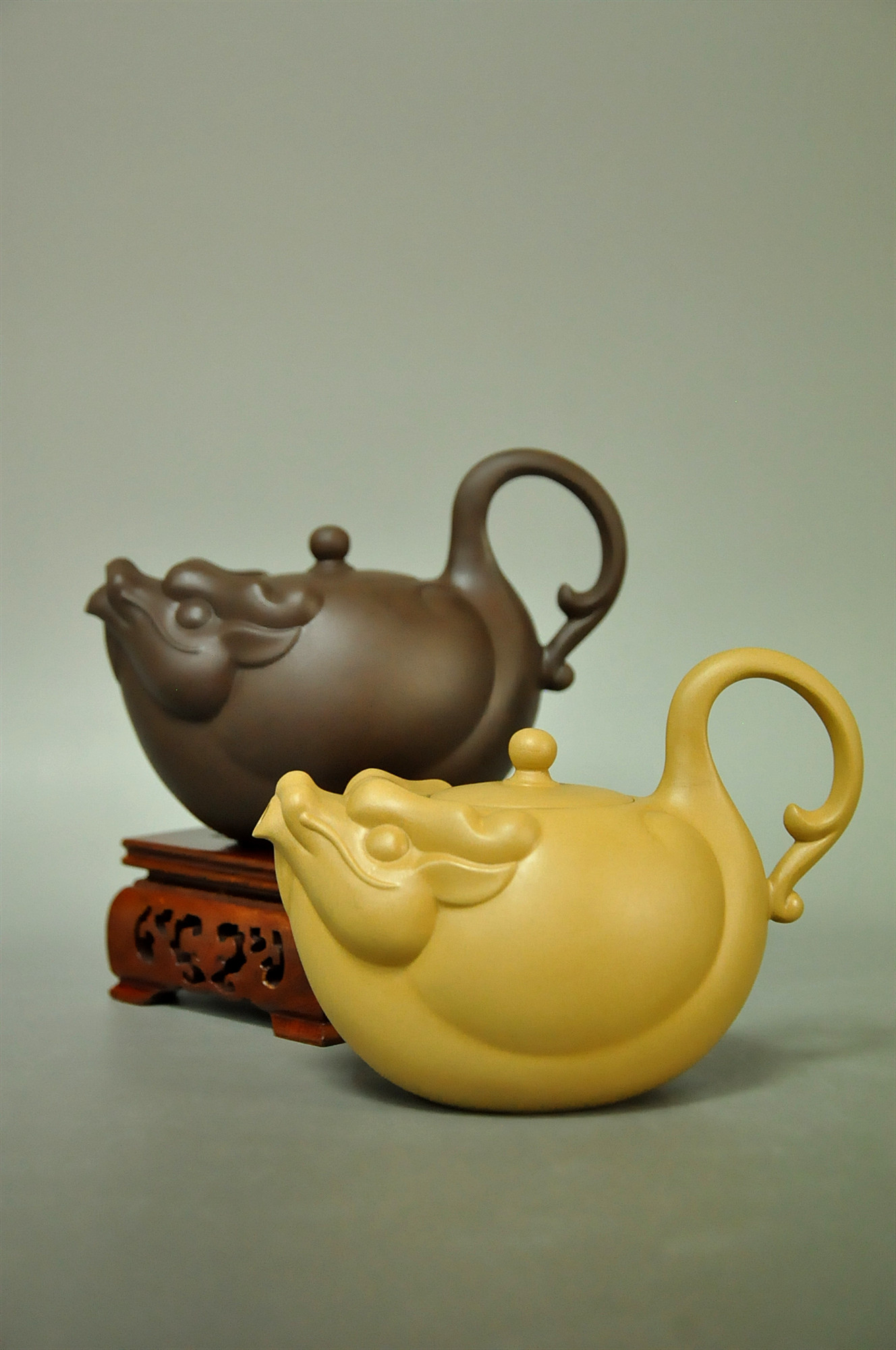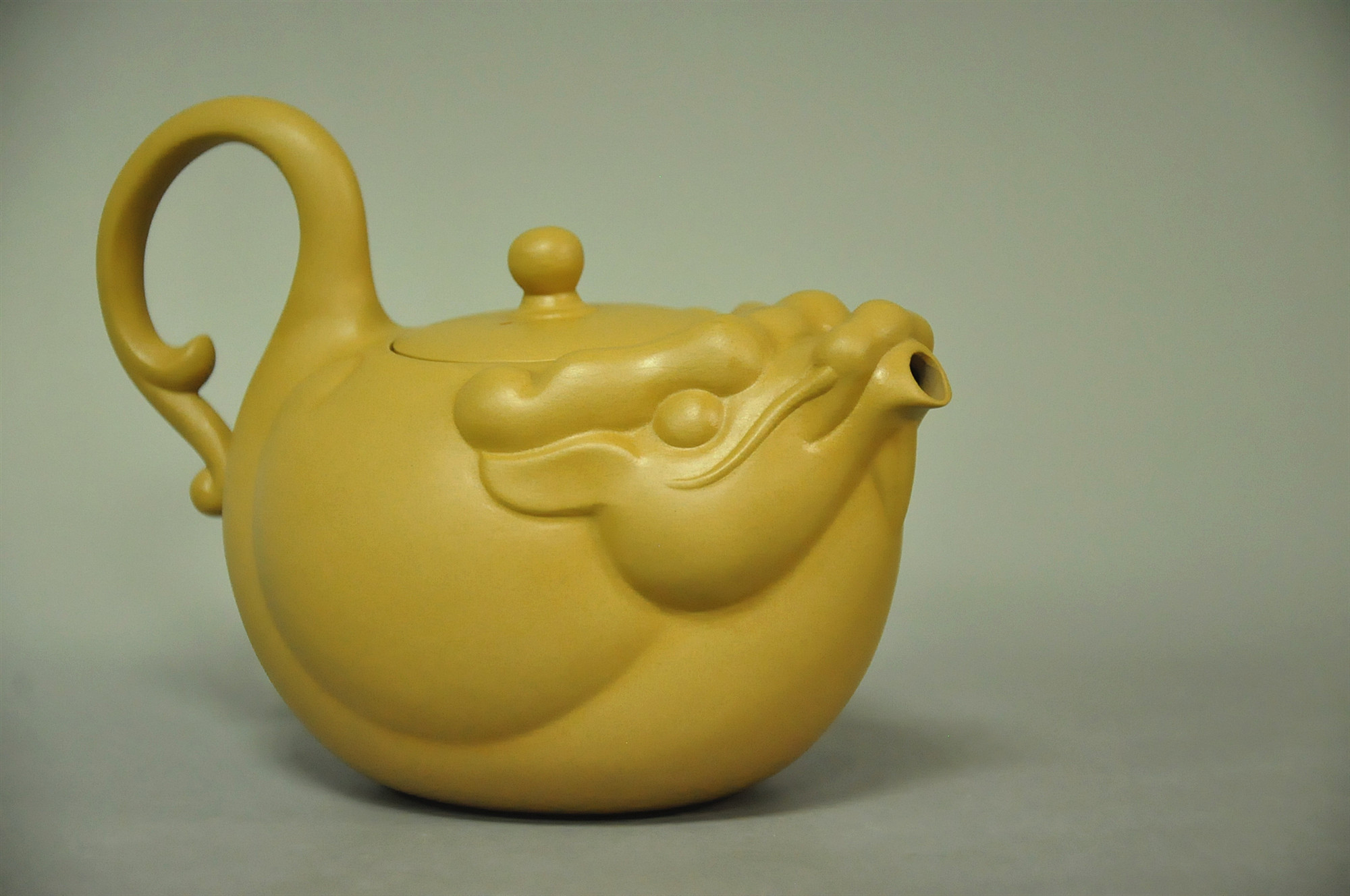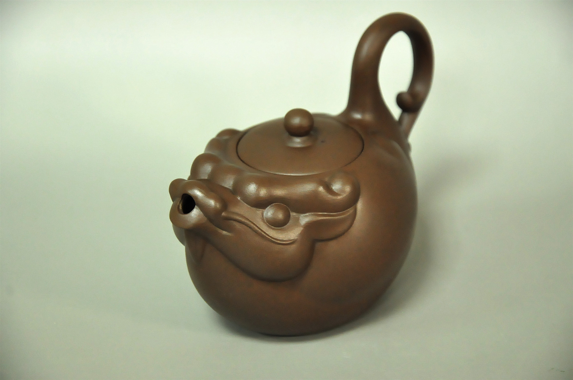 龍壺全貌如元寶,表現出圓融圓滿的感覺,象徵大器、高尚,並追求共榮並茂的理想。 The overall appearance of the dragon pot is like an ingot, showing a sense of harmony and perfection, symbolizing greatness, nobility, and pursuing the ideal of mutual prosperity and luxuriance.